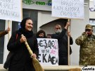 Также перед судом активисты устроили импровизированный мини-спектакль. Участник акции в маске министра МВД Арсена Авакова защищал от присутствующих мужчину в маске Владимира Зеленского. А девушки в масках Зверобой и Федины прогнали обоих вениками.