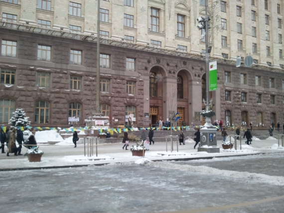 Со сцены на Майдане звучит песня Тараса Петриненко "Украина!". Здесь баррикады не разобраны. Люди греются у бочек с огнем, пьют чай. Девушки-волонтеры разносят бутерброды с сыром и колбасой. На углу Крещатика и Городецкой дежурит скорая помощь.