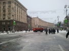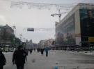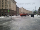 Улица Крещатик возле центрального выхода из метро заблокирована "Беркутом". Бойцы стоят посреди дороги держа перед собой железные щиты. К ним периодически подходят прохожие, фотографируют и высказывают свою точку зрения по ночных событий.