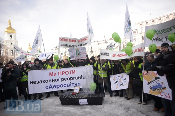 Более 100 работников авиакомпании "АэроСвит" вышли с митингом к отелю Hyatt Regency возле Софийской площади, где проходила выставка гражданской авиации, с требованием выплаты заработной платы.