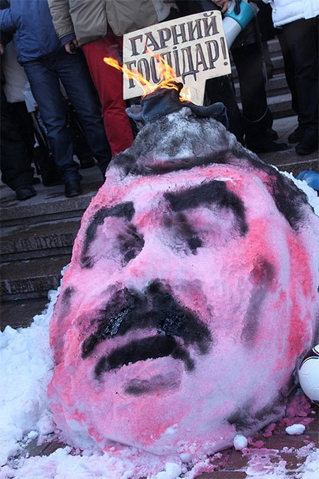 Около сотни людей собрались под зданием Киевгоргосадминистрации. Преимущественно это - активисты "Батькивщины". Они установили снежную "скульптуру", похожую на председателя КГГА Александра Попова с табличкой "Хороший госпидар" и горящей шапкой. Так оппозиция выразила свое отношение к бездеятельности столичной власти при ликвидации последствий снегопада.