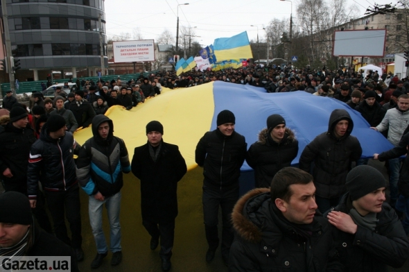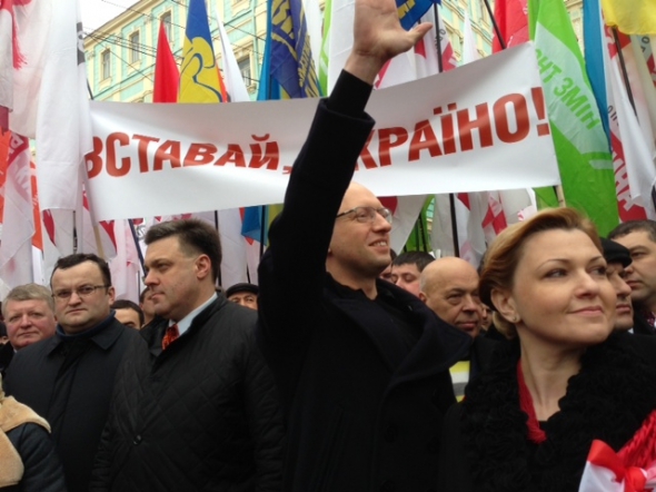 Более 10 тысяч жителей Ивано-Франковщины прошли маршем по центральной улице Ивано-Франковска в рамках общенациональной акции "Вставай, Украина!". Колонну возглавляли председатель фракции "Батькивщина" Арсений Яценюк, фракции УДАР Виталий Кличко и фракции "Свобода" Олег Тягнибок. Из шести акций оппозиции, это была единственная, на которой присутствовал Кличко.