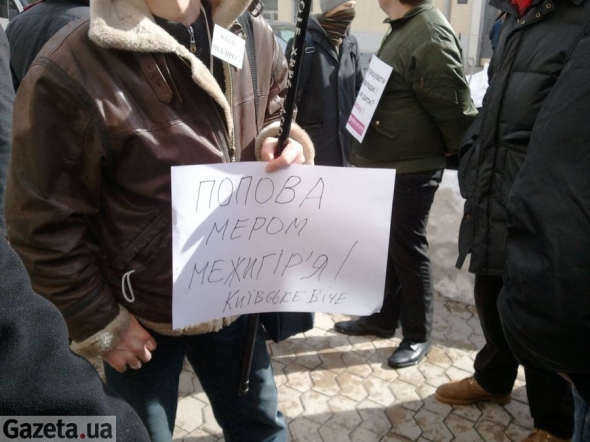 Люди держали флаги розового цвета с надписями "Общественное движение "Киевское вече" и плакаты "Попов, давай до свидания"," Попова в отставку" и "Киевляне все видят, Киевляне - не простят". На последнем - фото с изображением нардепа Александра Бригинца , которого бьют "беркутовцы" у Гостиного двора. Вход во двор Администрации был закрыт железными турникетами. Возле них - около 30 правоохранителей. Протестующих к зданию не подпустили.