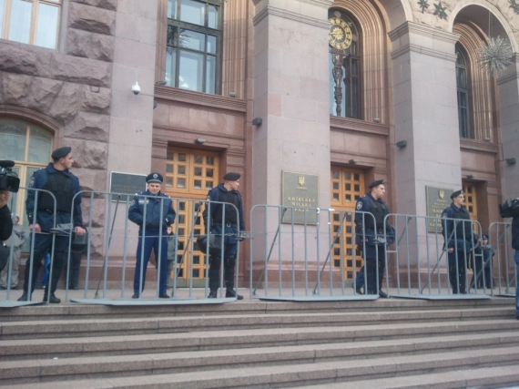 Работников мэрии и Киевсовета пропускают по удостоверениям через вход в общественные приемные. Центральный вход закрыт. У него также дежурит милиция.