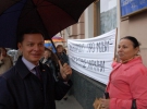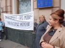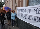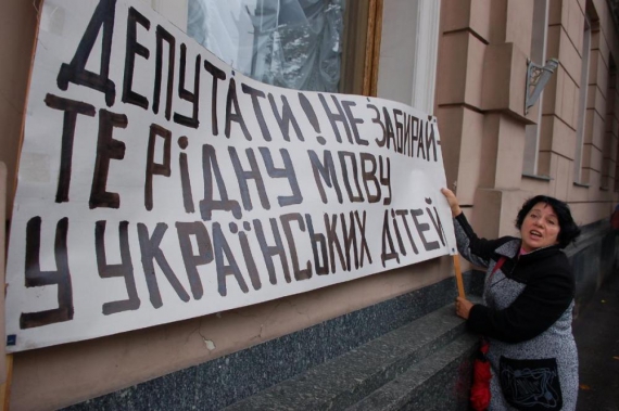 Между тем, под стенами парламента около десяти человек протестовали под зданием парламента против законопроекта о языках Александра Ефремова, коммуниста Петра Симоненко и "литвиновца" Сергея Гриневецкого. Они повесили плакат с надписью: "Законопроект о языках: нож в сердце Украины".