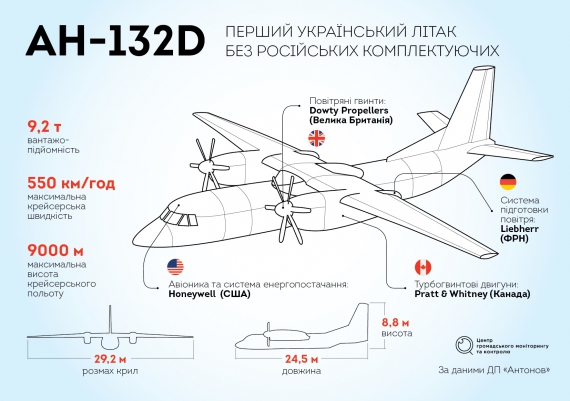 В строительстве самолета использовали преимущественно украинские, а также иностранные комплектующие высокого качества. В частности, турбовинтовые двигатели закупили в канадской компании Pratt & Whitney, воздушные винты - в британской Dowty Propellers. Кроме того, авионику и систему энергоснабжения на самолете обеспечила американская компания Honeywell, а система подготовки воздуха - немецкая Liebherr.