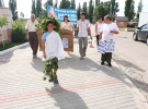 - Впереди колонны - мальчик лет 10 в образе "судьи": завязанной сторону белой тканью и венком из зеленых листьев. Держит в руках маленькие "весы Фемиды". На одной из чаш прикреплен табличкой с надписью: "Измена, подлость, жадность", на другой - "Совесть, честь, верность". Позади мужчины несут огромный плакат с изображением тушки курицы и председателем Кутового и надписью: "Вячеслав Кутовой. Депутатина тушкованая. Сдай мандат, как обещал". Далее - остальные митингующих. Чуть поодаль едва передвигаются две уже довольно пожилые женщины, опираясь на зонтик.