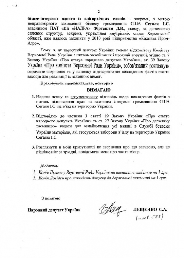 В частности, в одном из депутатских запросов Лещенко требовал вернуть право въезда на территорию Украины гражданину США Сегалю И.С. Иванов напоминает, что братья-близнецы Сегал Илья Самойлович и Сегал Вадим Самойлович - бывшие акционеры банка "Надра", российского "Петрофф-банка" и "клиенты" Интерпола. Осенью 2008 года, во время кризиса, братья Сегали взяли в банке "Надра" кредит на 25 млн. долларов под 12%, после чего перевели деньги в известный своей лояльностью к различного рода махинаторам латвийский банк "Trasta Komercbanka". Кредит Сегали возвращать явно не планировали, в связи с чем начали процедуры банкротства своих предприятий, на которые оформлялись ссуды.