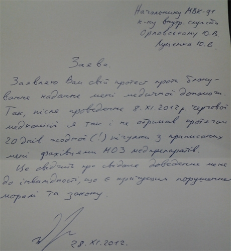 "Так, после проведения 8.11.2012 года очередной медкомиссии я так и не получил в течение 20 дней ни одной (!) таблетки из прописанных мне специалистами Минздрава медпрепаратов", - отметил Луценко.