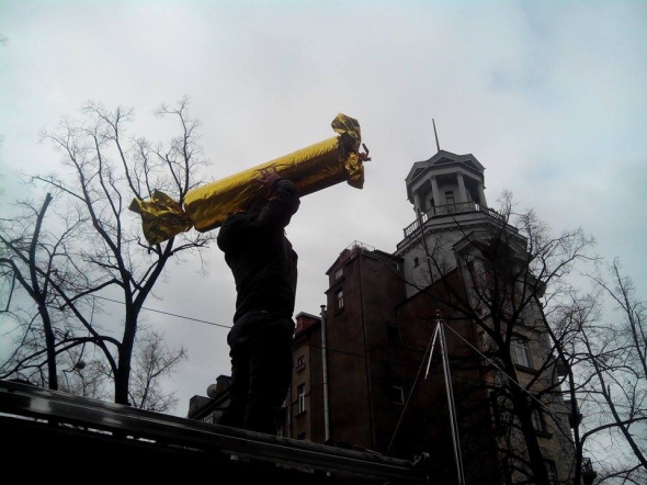 Организаторы принесли бутафорские гигантскую конфету и билет в Россию. Конфету вручили, чтобы владелец Roshen поехал в Россию, где недавно имел шоколадную фабрику.