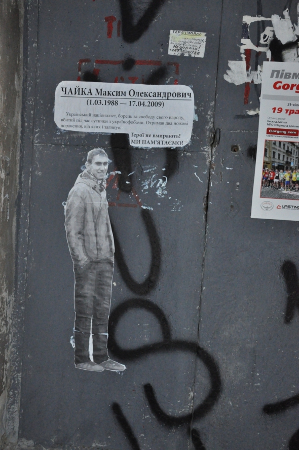 Во Львове появились полуметровые изображения убитого 4 года назад в Одессе националиста Максима Чайки. Изображение было расклеены в центральной части города, в частности на улицах Саксаганского и Шота Руставели. Это черно-белое, распечатанное изображение парня в полный рост с небольшой информационной текстовкой рядом.