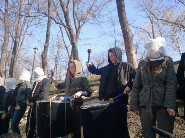 Когда организаторы акции пошли на встречу в КМУ, остальные участники остались стоять на бордюре. На голову надели белые мешочки, на шеи - веревки. На трех мужчинах висели плакаты с надписью "обреченные", некоторые держали в руках плакаты с надписями: "Я не хочу умирать", "Я не из Енакиево, но тоже хочу жить", "Моя жизнь, или новый мерс прокурору?". Несколько активистов также принесли на акцию барабаны и постоянно в них били.