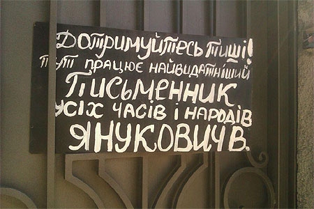 Пять девушек - членов Коалиции участников Оранжевой революции, пришли к Администрации президента, чтобы почтить литературный талант Януковича. "Фанаты" литературного творчества президента Виктора Януковича повесили возле АП табличку с надписью: "Соблюдайте тишину! Здесь работает выдающийся писатель всех времен и народов Янукович В."