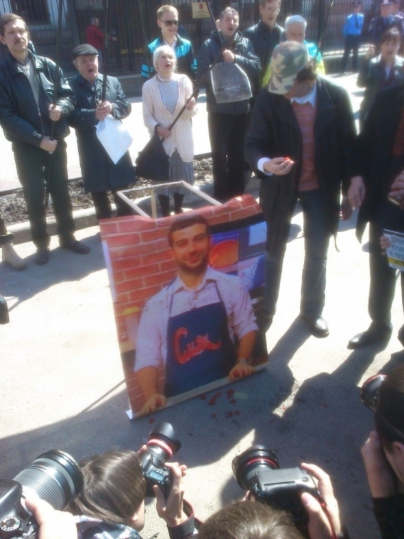 На парковке перед посольством активисты установили портрет шоумена и бросали в него помидорами. Так решили заклеймить его за то, что в свои высказываниях он оскорбил память миллионов украинцев, погибших во время освободительной борьбы в начале прошлого века.