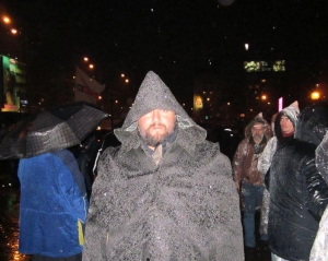 "Врать не надо - людей мало как для Киева. Киев спит ... Милиции - по три мента на каждого митингующих. Из всех митингующих процентов десять неадекватных, экзальтированных лиц, как женского так и мужского пола. Всю ночь лил дождь. Спрятаться негде. Беркут кружил вокруг нас: то в кольцо возьмут, то отрежут одних от других - так забавлялись, наверное. Затем, правда, стихли. Несмотря на большое количество ментов и автозаков, страха не было совсем ".