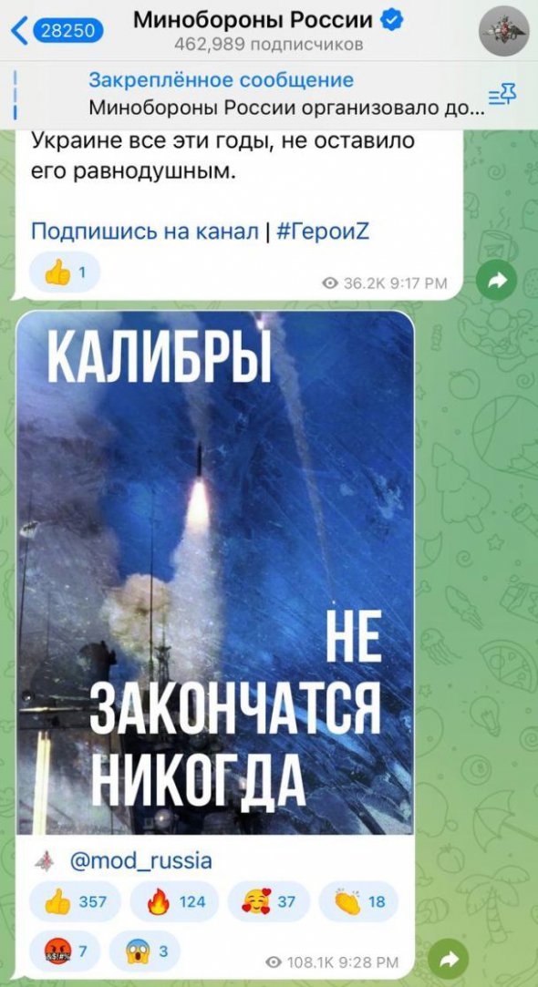 Якобы "Калибры", которыми РФ беспощадно атакует Украину, у врага никогда не закончатся. Об этом в Twitter в четверг написало российское Минобороны, опубликовав соответствующее террористическое фото.