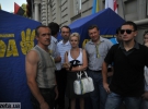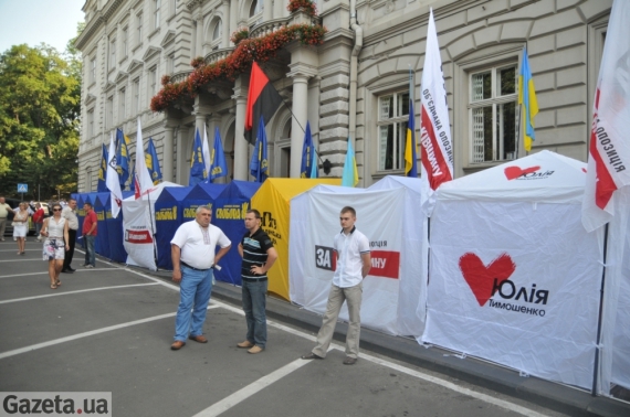 Между тем в ЛОГА собирается все больше людей. Большинство располагаются в парке напротив здания. Там разложена одна палатка. Забор завешен оппозиционными призывами. Также прохожим и автомобилистам раздают сине-желтые ленточки с надписью: "Моя мова, моя свобода".