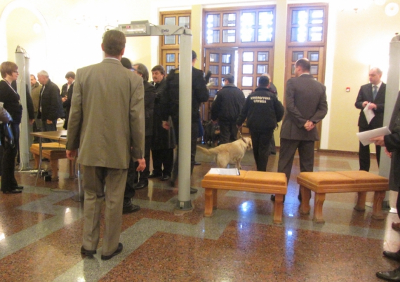 Здание театра проверили с помощью служебных собак. Всех делегатов, включая ВИП-персон и преданных ветеранов, провели через "рамку" и проверили металлоискателем.