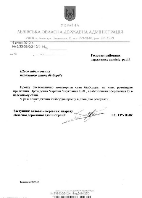 "Прошу систематически мониторить состояние билбордов, на которых размещено поздравление Президента Украины Януковича В.Ф., и обеспечить сохранение их в надлежащем состоянии", - пишет в своем распоряжении Груник.
