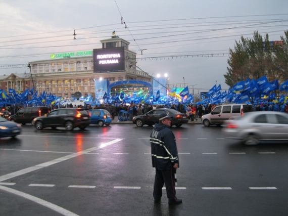 Вечером 26 октября в Донецке состоялся массовый митинг в поддержку Партии регионов. На нем присутствовало не менее 3 тысяч человек. На центральную площадь местные участники сходились колоннами. Жителей районных городов Донецкой области доставляли автобусами.