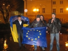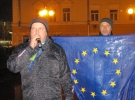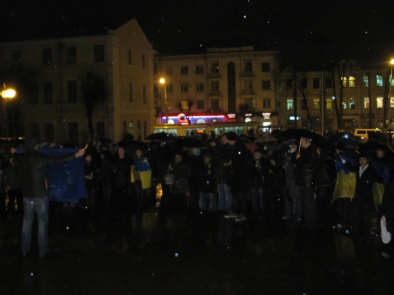 Люди стоят с украинской и европейской символикой. Виктор Бронюк в громкоговоритель запевает государственный гимн. Люди активно подхватывают, держат руки на сердце. Несмотря на дождь, никто не расходится.