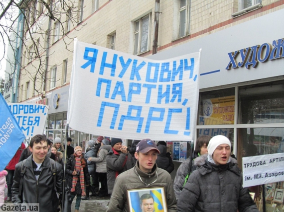 Впереди колонны шел парень с портретом Виктора Януковича. В руках активисты держали плакаты с надписями: "Федорович, мы в тебя верим", "Янукович, партия, ПДРС!", "Януковича пожизненно".