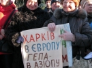 Две женщины держат плакат от гостей из Харькова. На нем написано: "ХАРЬКОВ В ЕВРОПУ! ГЕПА – В АЗИОПУ" В толпе невысокий мужчина в серой кожанке снимает выступающих и тех, кто держит стяги на видео.