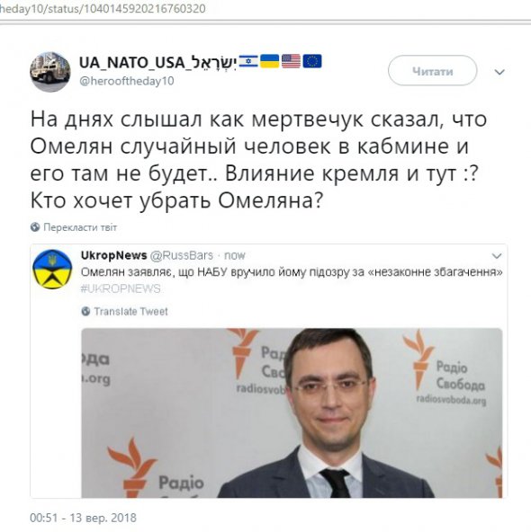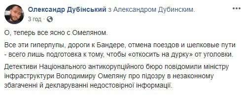Утром 13 сентября детективы НАБУ сообщили о подозрении в незаконном обогащении и недекларировании министру инфраструктуры Владимиру Омеляну. Как сообщила пресс-секретарь бюро Светлана Олефира, доходы министра значительно меньше расходов. Кроме того, 2015-го в должности заместителя министра инфраструктуры он купил внедорожник и получил $90 тыс. и более €25 тыс, которые не задекларировал. Не внес в декларацию и информацию об аренде домов.