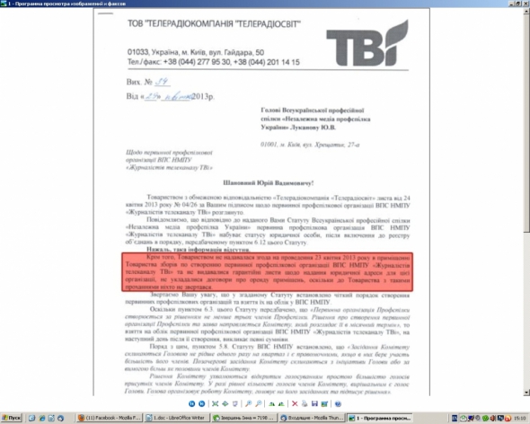 Одновременно они заявили, что профсоюз журналистов канала ТВi не является правомочным, о чем они сообщили председателю всеукраинского профсоюза Юрий Луканову.