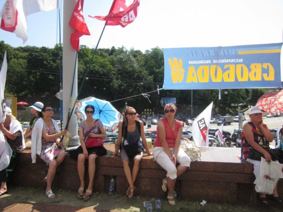 "Этой ночью познакомились с полковником СБУ. Нам волонтеры передали две палатки - один для голодающих, другой для регистрации. Прибежал полковник в 4 утра, сказал, что нельзя ставить этот шатер, ибо никакого солнца нет. Мы их нормально отразили - все стали в шеренгу, и все. Веселая ночка была. А день какой-то слабенький - забрали "Беркут", одна милиция стоит. Они больше нас боятся, чем мы. С милиционерами мы здесь общались. Веселые ребята. Легко идут на разговор. Такие же люди, как мы. Можем быть здесь хоть и неделями. Ну и что, что жара. Мы же Оранжевую на морозе выстояли. Люди подъезжают понемногу. Сегодня приехала львовская организация "Тризуб". Радикалы. Людей в полдень здесь было более тысячи, ближе к двум. После газа грудная клетка болела немного, хотя я был сравнительно далеко - в метрах 15. Газ пошел по ветру. Кому-то из наших щитом ноготь сорвали на большом пальце на ноге. Незначительные травмы. Газ в ответ - это самозащита. Газовые баллончики можно же купить в любом военном магазине. У меня нет. Быстро бегаю. "