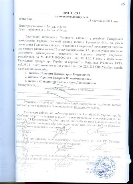 В СМИ попали протоколы допроса Попова, Сивковича и Коряка - главных виновников, по версии Пшонки, кровавого разгона Евромайдана. Однако, согласно данным допроса, все вопросы ведут к Клюеву.