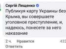 Бывший нардеп, член наблюдательного совета Укрзализныци Сергей Лещенко напомнил политику, что за публикацию карты Украины без Крыма грозит уголовная ответственность.