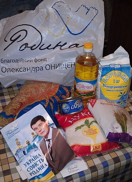 Кроме того, продуктовые наборы пенсионерам в Киевской области раздавал от благотворительного фонда "Родина" Александр Онищенко, сообщает пользователь сети Facebook Igor Ripa.