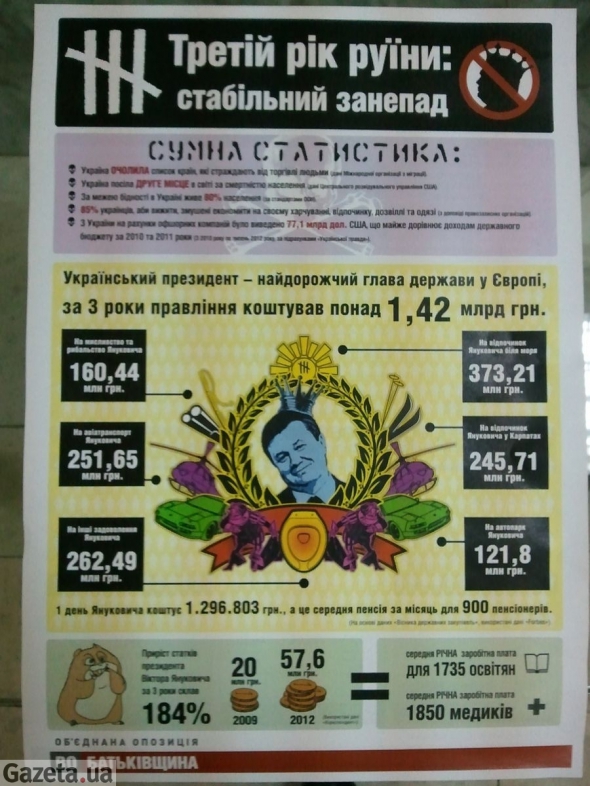 На листовке президент Виктор Янукович изображен с короной на голове: "Один день Януковича стоит 1.296.803 грн, а это средняя пенсия за месяц для 900 пенсионеров".