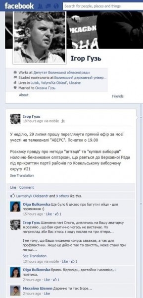 В ответ Игорь Гузь написал реплику: "Уважаемая Ольга, глядя на вашу аватарку я понимаю, что вам критически чего-то не хватает. Ну, например, чтобы вас кто-то с ходу послал на три буквы ... И не потому, что ваша писанина кому-то мешает, а так для профилактики. Если это действительно так, то свисните, может пригожусь при случае ... ". В профсоюзе заявляют, что Игорь Гузь "позволил себе публично (в соцсети Facebook) унижать честь и достоинство" руководителя интернет-издания, которая заметила о подкупе им избирателей, в частности, об установлении батутов и раздачу яиц на празднике пгт Ратное Волынской области. "Информация об этом факте опубликована в интернет-издании" Волынь-Post ". Эта же информация подавалась в позитивном свете на официальных страницах ВОПО" Батькивщина "и областной организации" Фронта перемен "", - говорится в сообщении профсоюза.