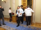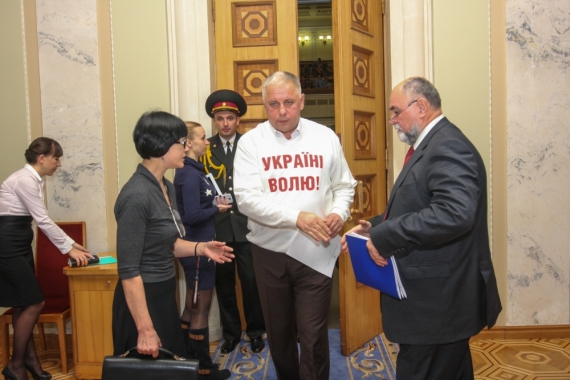 Сас заходит в сессионный зал. Здесь большинство его коллег по фракции в таких же футболках. Некоторые в белых регланах: "Украине волю!". "Ударовцы" снова одеты в красные регланы "Украина - это Европа!". Присутствующие регистрируются. На табло - 365. К трибуне идет лидер "Свободы" Олег Тягнибок.