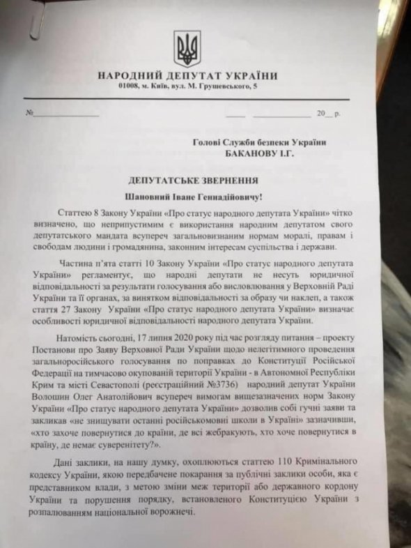 К председателю СБУ Ивану Баканову обратились народные депутаты с требованием начать уголовное производство касательно антиукраинского высказывания члена ОПЗЖ Олега Волошина.