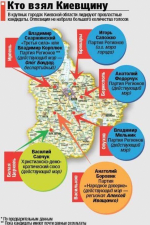 "Если после выборов 2006 года 90% всех советов составляли депутаты, а также мэры городов от БЮТ, то теперь такое большинство будут составлять представители Партии Регионов. Ничего удивительного в этом нет. Просто элита и бизнес, который проживает на Киевщине, традиционно ориентируется на власть", — сказал один из членов предвыборного штаба "регионов".
