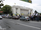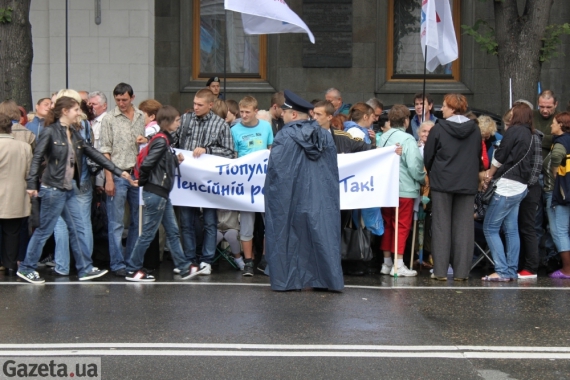 Акция собрала несколько тысяч человек. Они окружили здание парламента со стороны ул. имени Грушевского и Мариинского парка. Держат флаги с партийной символикой. Митингующие всех возрастов - много как студентов, так и пенсионеров. Пенсионеры сидят на стульях, которые принесли с собой, рядом стоят термосы. Вдоль людей со стороны дороги и Мариинского парка через каждые пять-десять метров стоят сотрудники милиции. Со стороны смотровой площадки возле Верховной Рады митинг видгорожений железными щитами. По ту его сторону на заборе висит плакат "Пенсионная реформа - стоп". Там недавно проводили митинг противники пенсионной реформы.