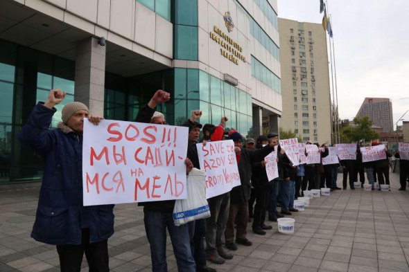 Портовики также рассыпали перед входом в Мининфраструктуры несколько ведер песка, который символизирует обмеление подходных каналов и операционных акваторий портов Азовского региона.
