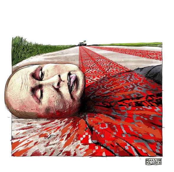 Художник Максим Паленко изобразил президента государства-агрессора РФ Владимира Путина на фоне орнамента и танка Вооруженных cил Украины.