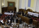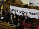Около 30 "бютовцев" растянули плакаты над президиумом и ложей Кабинета министров с надписями "Руки прочь от Тимошенко", "Прекратить политические репрессии!"
