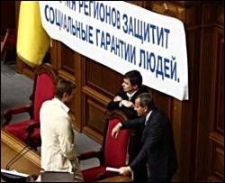 Кроме того, в сессионном зале, как и в предыдущие дни, висят плакаты "Министры подождут, сначала помогите людям", "Партия регионов защитит социальные гарантии людей", "Алкоголиков и националистов - в отставку".