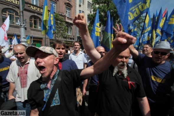 Митингующие держали в руках лозунги: "ВО "Свобода" - угроза миру в Украине!", "Крым не предаст памяти павших!". Во время митинга было сожжено чучело народного депутата от партии "Свобода" Ирины Фарион.