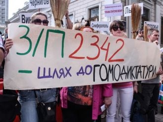 Несколько десятков человек собрались под Верховной Радой, протестуя против "узаканивания" гомосексуализма. Они стали на противоположной стороне от здания парламента. Большинство митингующих - люди пожилого возраста. Они заверили, что являются христианами и борются за семейные ценности. Митингующие скандировали "Нет - гомосексуализму!", "Позор депутатам!", "Мы принесли метлы, чтобы очистить Украину", "Нет законопроекту 2342!" и тому подобное.