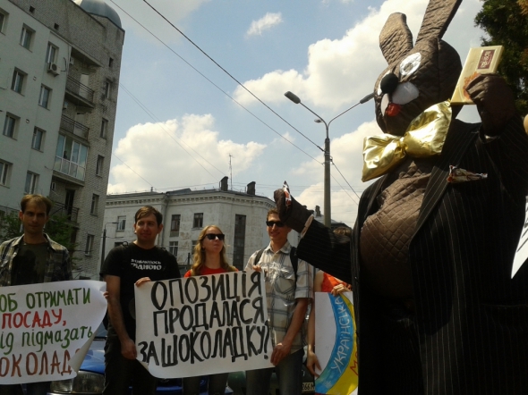 Молодые люди развернули плакаты: "Зачем оппозиции лживый мэр?", "Порошенко меняет взгляды, как обертки", "Чтобы получить должность, следует подмазать шоколадом", "Оппозиция продалась за шоколадку?" и тому подобное.