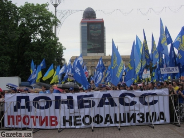 Во советскую песню "Вставай, страна огромная, вставай на смертный бой!" начали собираться участники митинга антифашистов в Донецке. Ответственные за явку уже в 16.00 ждали своих участников в оговоренных местах с флагами ПР и табличками, указывающими на принадлежность к тому или иному району. Жителей райцентров свозили в Донецк автобусами. Для проезда нужен был спецпропуск, движение в центре города для троллейбусов было закрыто. Среди участников митинга были и дети.
