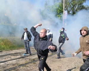 Несколько молодых людей 9 мая рвали, жгли и топтали красные флаги перед зданием горсовета во Львове, скандируя: "Слава Украине! Героям слава".