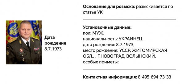 Министерство внутренних дел страны-агрессора Российской Федерации объявило в розыск главнокомандующего Вооруженными силами Украины Валерия Залужного.