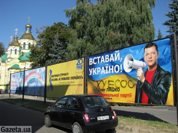 Билборд с портретом народного депутата Олега Ляшко находится рядом со Свято-Воскресенским собором. Кроме того за ним - колонна Божьей матери, памятник Тарасу Шевченко и центральная площадь города - Независимости.